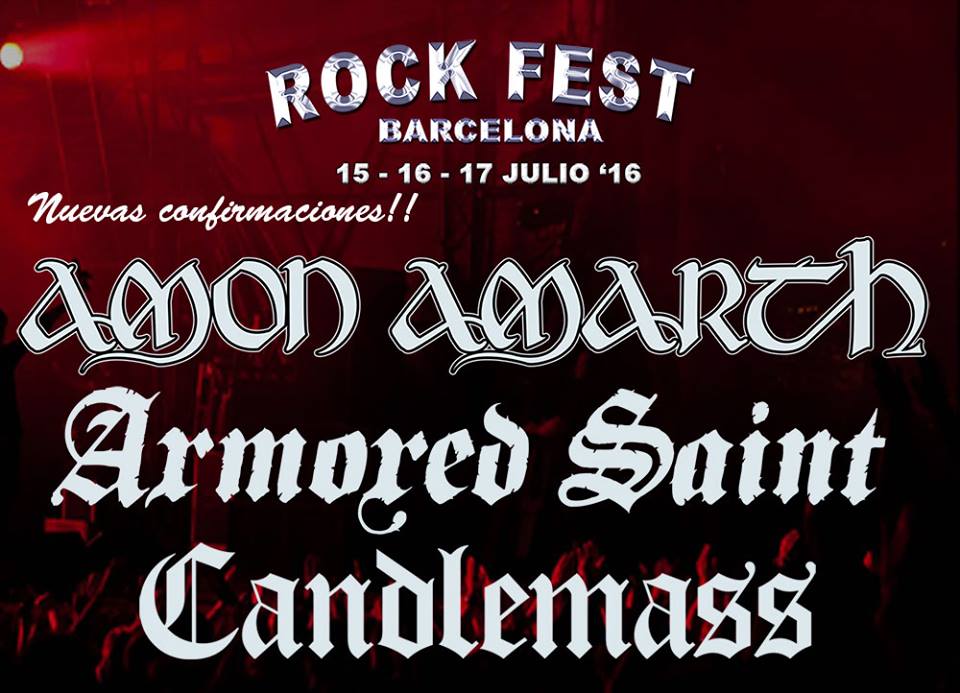 El Rock Fest Barcelona 2016 ha confirmado a tres bandas más para su próxima edición: Amon Amarth, Candlemass y Armored Saint. Se unen a los anteriormente anunciados Iron Maiden, Whitesnake, Twisted Sister, Unisonic, Blind Guardian, Battle Beast, Moonspell, Overkill, Kreator, Coroner, Doro, Orphaned Land, Baron Rojo, Dragonforce, Grave Digger, Heaven Shall Burn y Loudness.
